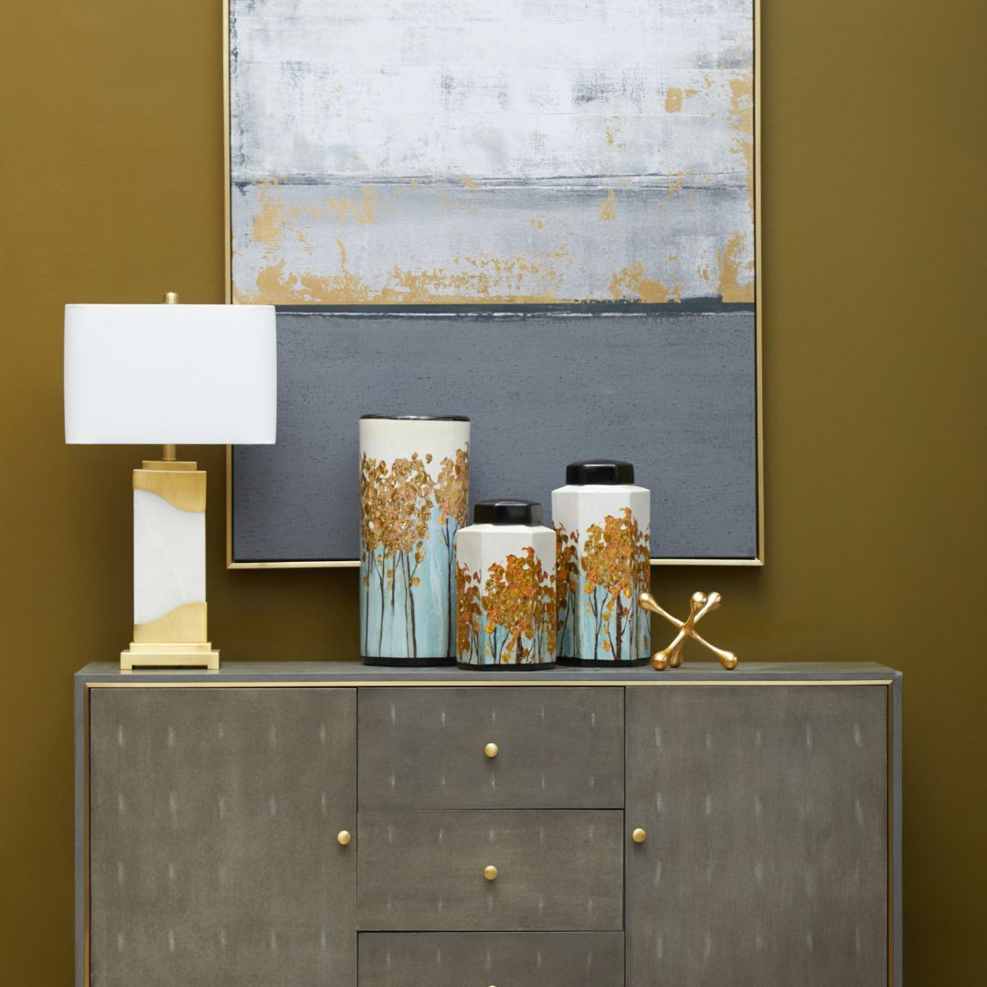 Enhance your space with this exquisite ceramic jar, showcasing subtle oriental golden artwork. Each piece is a masterpiece, exhibiting artisan craftsmanship. Elevate your decor with this decorative accent that brings a touch of elegance to any room.