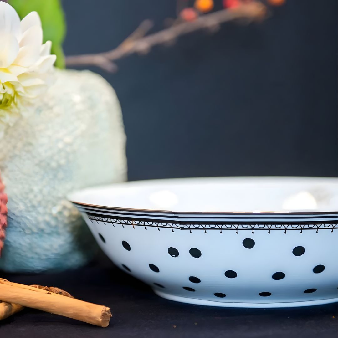 A set of 4 Black and White Dot pasta bowls with a touch of elegance! Crafted with meticulous attention to detail, these bowls are perfect for adding a contemporary flair to your kitchen or dining area. The eye-catching black and white dots create a chic and modern pattern that effortlessly complements any table setting. With a luxurious gold edge accentuating its sophisticated design, these bowls will surely impress your guests during family dinners, parties, or even special occasions.