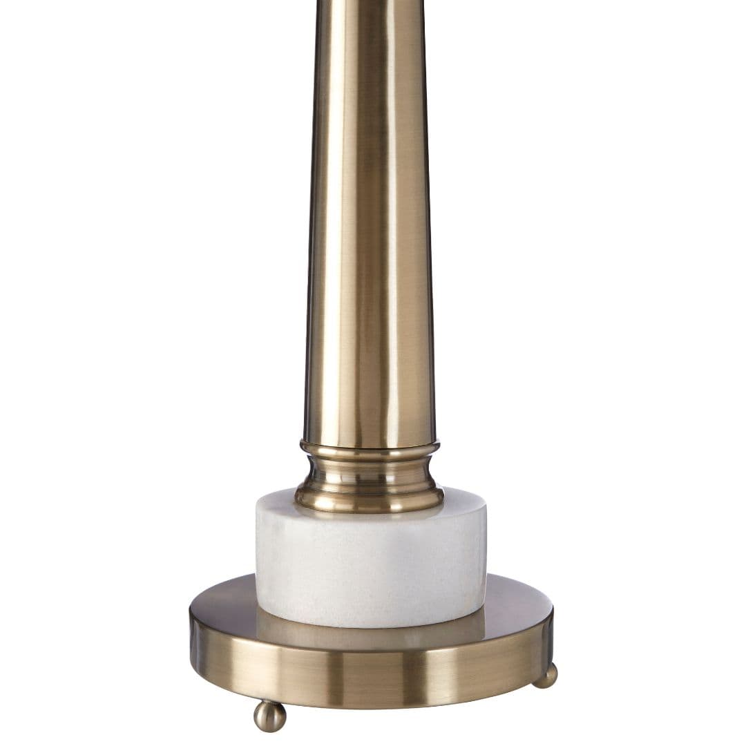 Illuminate your space with this chic table lamp featuring a tapered metallic stand and a hint of white rounded marble, beautifully complemented by a white fabric shade. Add a touch of sophistication to your home decor with this elegant piece.